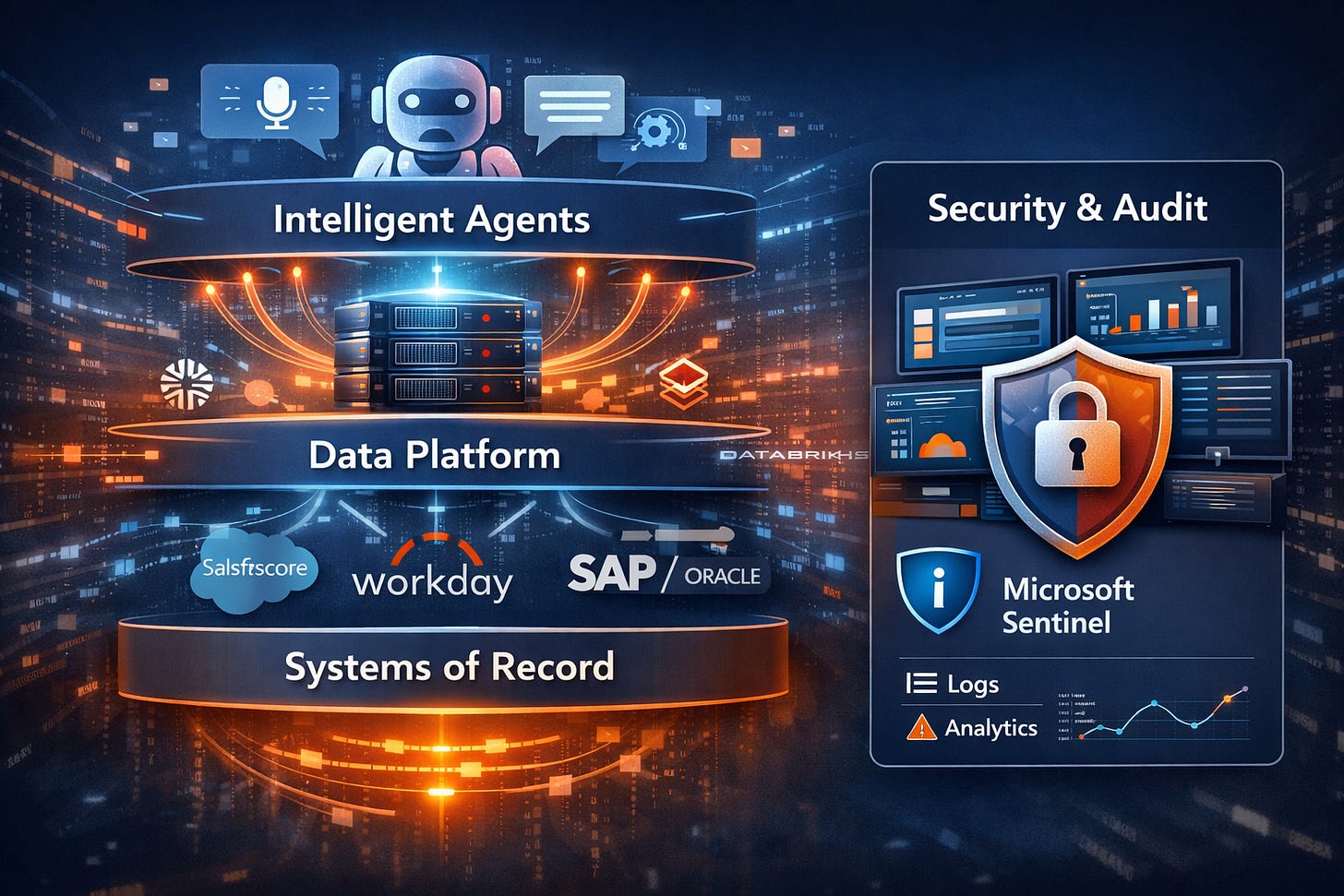 Intelligence and interaction layer (agents): Natural language requests, context retrieval, orchestration, and workflow triggers back into the systems of record.